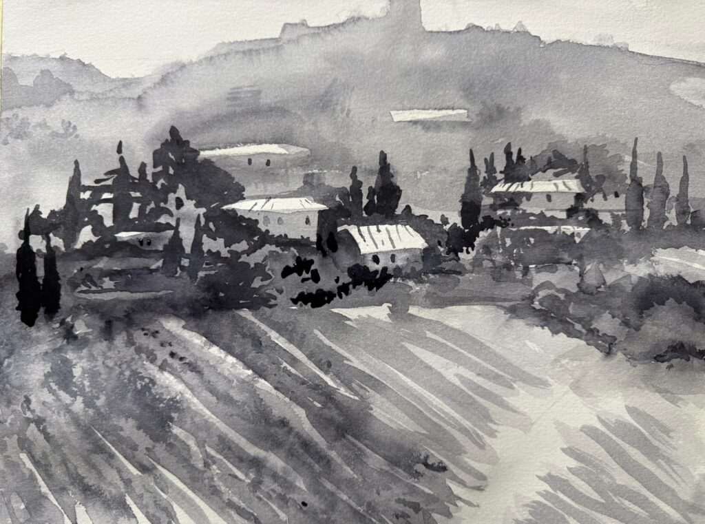 I’ve attached my value study and a more finished piece from the workshop from a reference Gary provided. I confess I don’t prefer to do buildings, but it’s always good to stretch your skills. I really admire the brush skills it takes to do sumi-e, and wanted to ask him how he encourages students to get the most use from a brush, but it was a packed workshop, and I didn’t get the chance.
